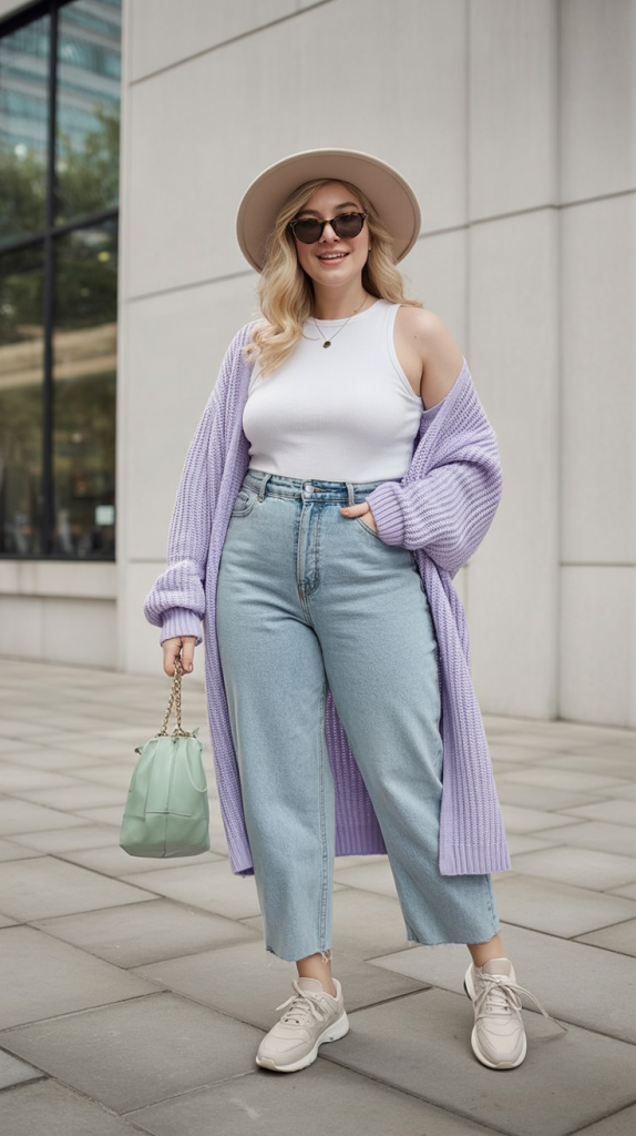 This look feels like a deep breath. The lilac cardigan softens the whole mood and makes chilly weather feel less annoying and more… romantic, honestly. Paired with light denim, it’s bright without being loud, and that easy drape gives you movement and comfort at the same time. It’s cute, but still grown—like you know what works for you, and you’re not trying too hard.