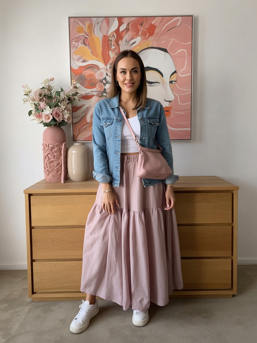 This outfit feels like a little mood lift in clothing form. The denim jacket keeps it grounded and practical, while the flowy skirt adds movement that instantly feels feminine and fresh. It’s that perfect sweet spot where you look dressy without feeling like you’re pretending to be someone else. Honestly, it gives “I’m living my life and I’m enjoying it” energy—even if you’re just doing normal things.