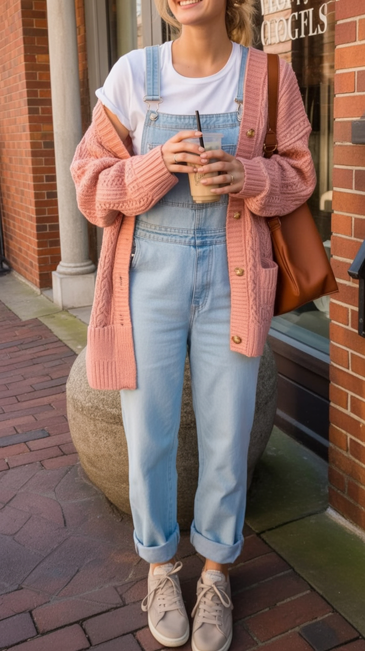 21. Overalls + Blush Cardigan for Cozy, Playful Cardigan Ideas