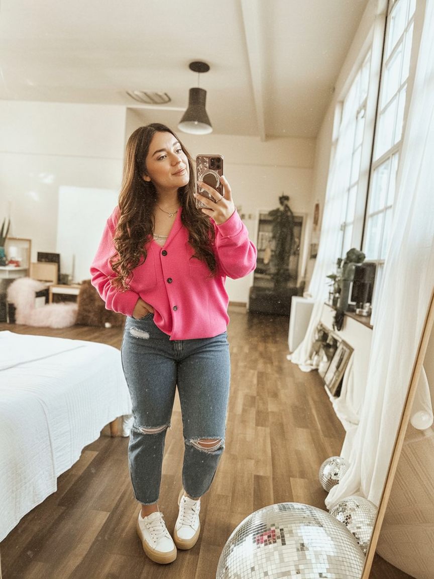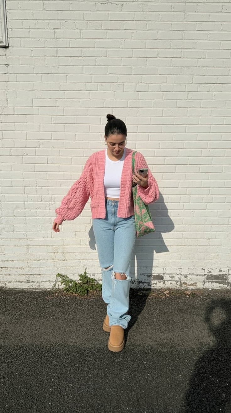This look feels like comfort with a little sweetness on top. The chunky pink cardigan is soft and cheerful, while the simple white top and denim keep it grounded. It’s the kind of casual outfit that makes a cold morning feel less annoying—like you’re wrapped up, but you still look cute and intentional.