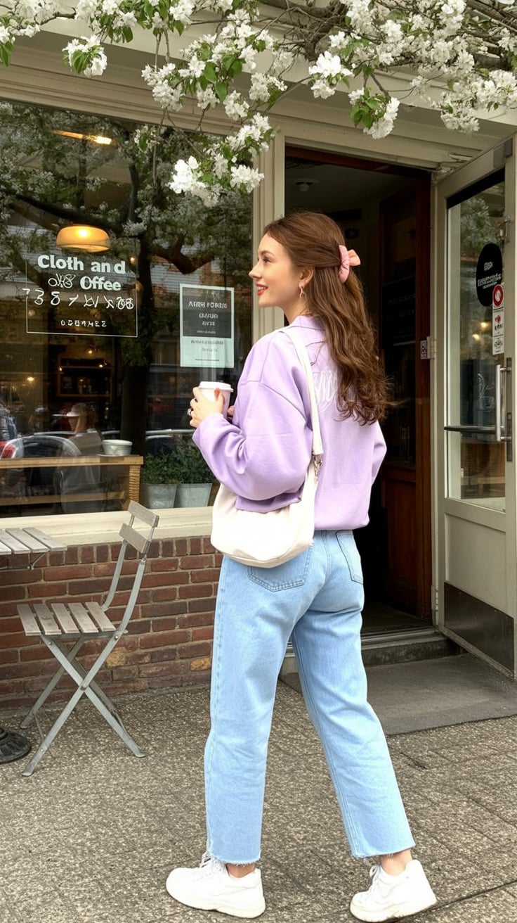 6. Lavender Sweatshirt + Light Jeans for a Sweet, Off-Duty Coffee Run
