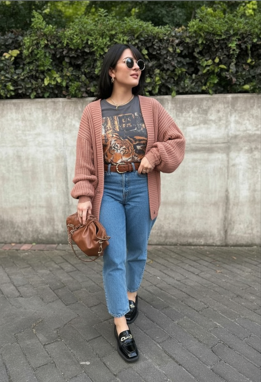 If you ever want to look like you’re effortlessly stylish (even if you’re running on three hours of sleep), this combo is your best friend. The graphic tee adds personality and a touch of fun, and the cardigan brings that cozy layer that makes cold spring days feel doable. It’s casual, it’s relaxed, and it still looks like you have taste—which, let’s be honest, is the goal.