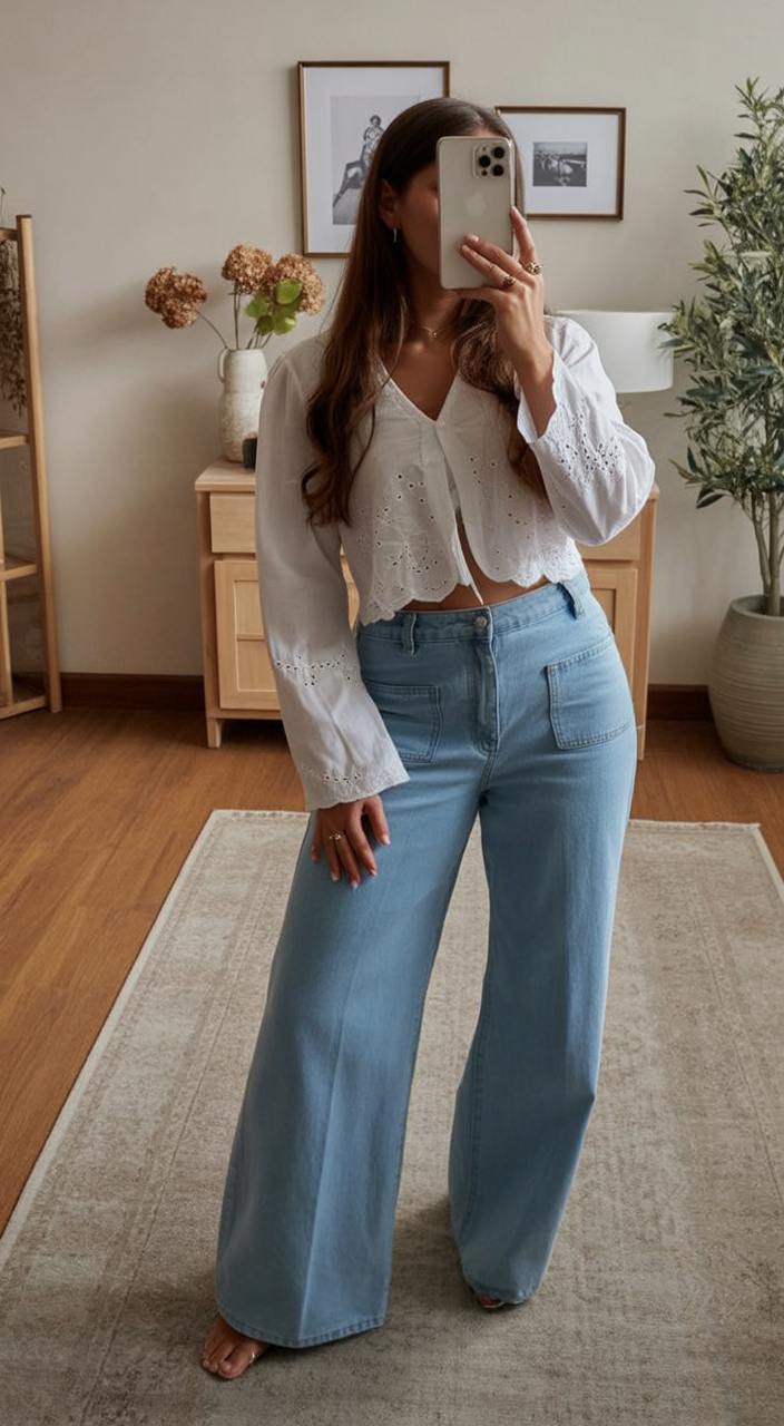 This outfit has that “quietly elevated” feel that always looks expensive, even when it’s not. The white blouse feels crisp and feminine, and the wide-leg jeans make the whole silhouette look modern and relaxed. It’s soft, clean, and a little romantic—without being too precious. Basically: effortless, but still special.