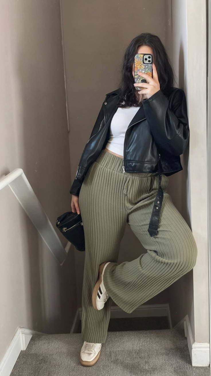 This look has that quiet confidence that turns heads without begging for attention. The leather jacket instantly gives structure and attitude, while the ribbed pants keep the vibe relaxed and wearable. It’s sleek, a little bold, and still totally comfortable—like you’re stepping into your “main character” moment, but you can still breathe, sit, and actually enjoy your night.