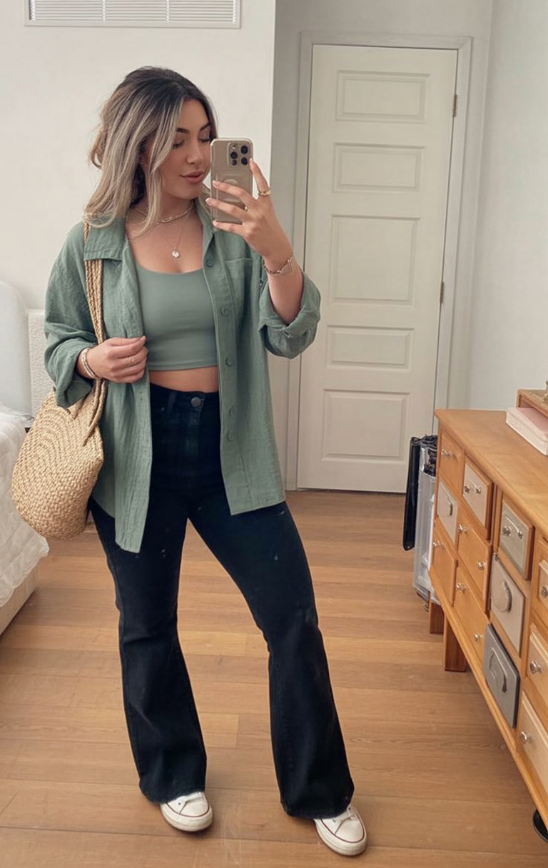 4. Sage Overshirt + Flared Jeans for a Fresh Neutral Moment