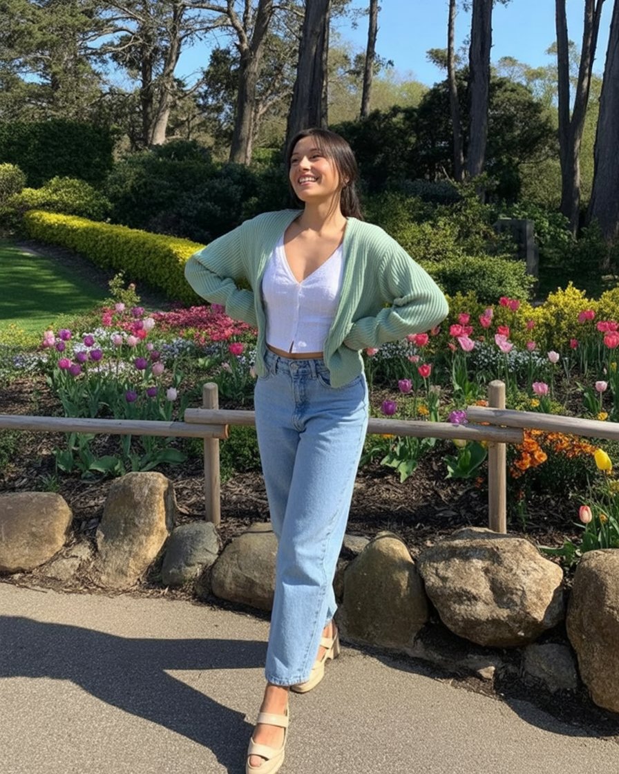 This look feels like the first warmish day after a long winter—light, hopeful, and kind of flattering in a “your skin looks great” way. The soft green cardigan brings a calm, pretty vibe, and the light denim keeps it airy without being flimsy. It’s the kind of outfit that makes you want to go outside, take a deep breath, and remember you’re allowed to feel cute for no reason.