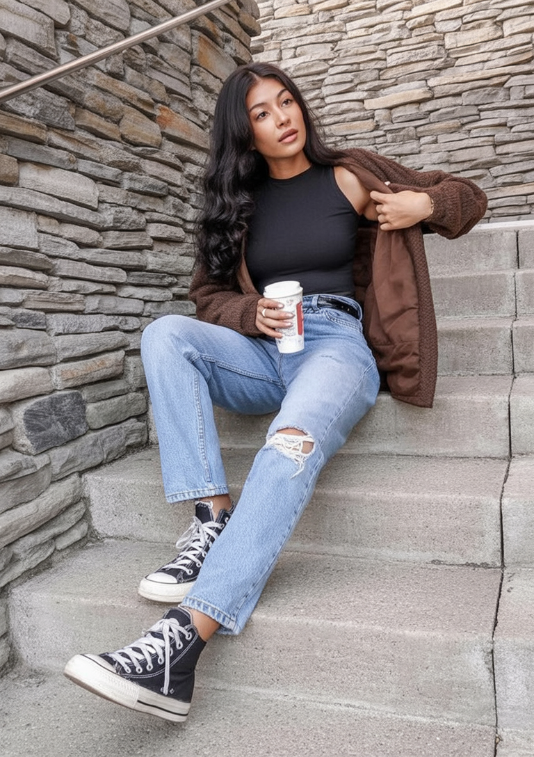 This look has that cool, slightly moody confidence that makes cold spring weather feel kind of cinematic. The brown cardigan brings warmth without looking heavy, and the black base underneath keeps it clean and modern. It’s casual, but it feels intentional—like you planned your outfit around your life, not the other way around.