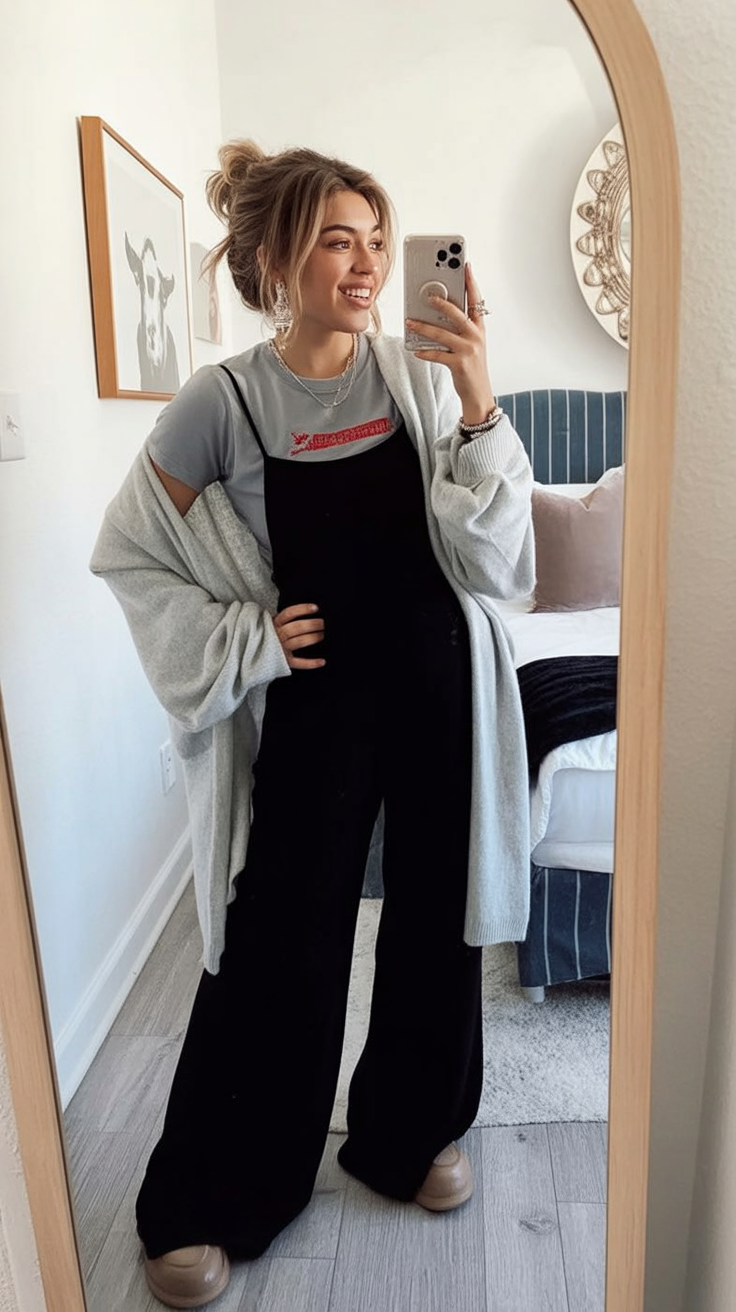 3. Wide-Leg Overalls + Soft Cardigan for Comfy Cool-Girl Layers