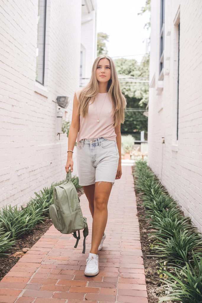 This outfit combines a soft pink sleeveless top with longline denim shorts, creating an effortlessly cool streetwear-inspired aesthetic. The muted tones give it a relaxed yet polished feel, while the addition of sneakers and a backpack makes it practical for travel days or city exploring.