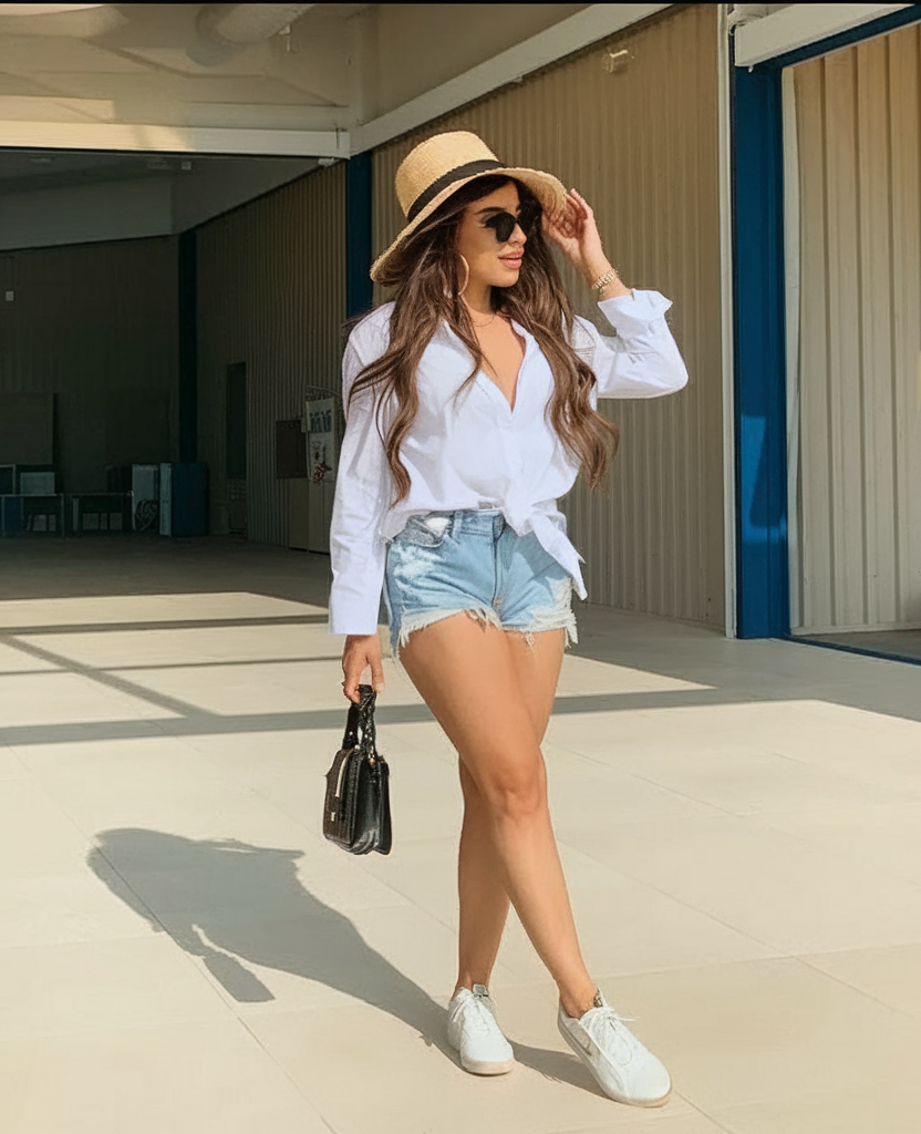 A crisp white button-down tied at the waist paired with distressed jeans shorts creates an effortlessly chic summer look. This ensemble is a staple for warm weather, balancing elegance with a hint of laid-back charm. The oversized sunglasses and straw hat add a sun-ready touch, while white sneakers keep it comfy for all-day wear.