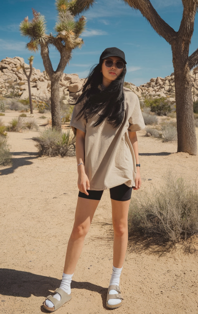 For those who love modest yet trendy outfits, this combination of an oversized neutral-toned tee with black biker shorts is a go-to. The black baseball cap and round sunglasses add an effortlessly cool touch, while the chunky socks and sandals bring a functional yet fashion-forward aesthetic.