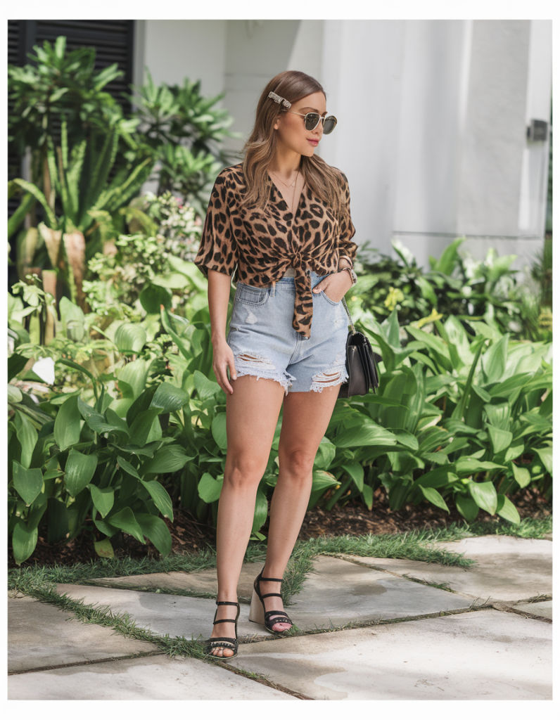 Animal prints remain a summer favorite, and this jeans simple look proves why. A cropped leopard-print blouse paired with distressed denim shorts creates a trendy yet easygoing ensemble. The knotted front of the top adds a flirty touch, making it ideal for a casual dinner or rooftop drinks. Finished with sleek black wedges and oversized sunglasses, this look radiates confidence.