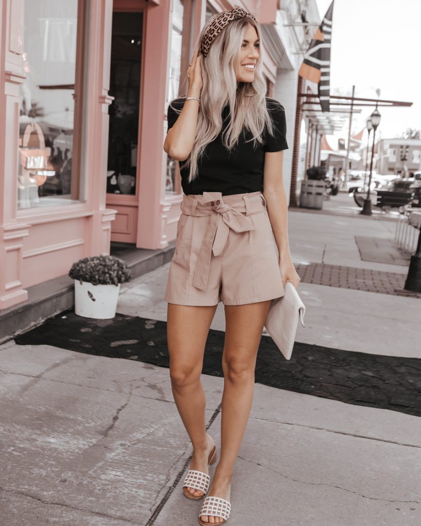 Nothing says chic like neutral shorts shirts in a tailored design. A black fitted tee tucked into beige high-waisted shorts creates a sophisticated balance of casual and elegant. The leopard headband adds a playful twist, while woven mules and a clutch bag complete this polished summer outfit.
