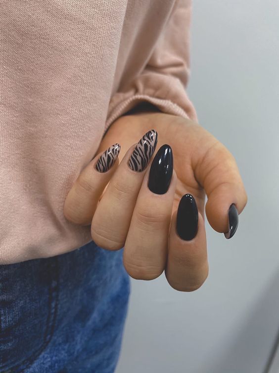 This striking set features a bold acrylic almond shape with a sleek, black finish. Two nails are adorned with a monochrome zebra print on a nude base, adding a touch of wildness to the sophisticated black. The contrast between the patterns and the solid black creates a modern, edgy look. This style is perfect for those who want to make a statement with their nails, blending simplicity with a bit of wild flair.