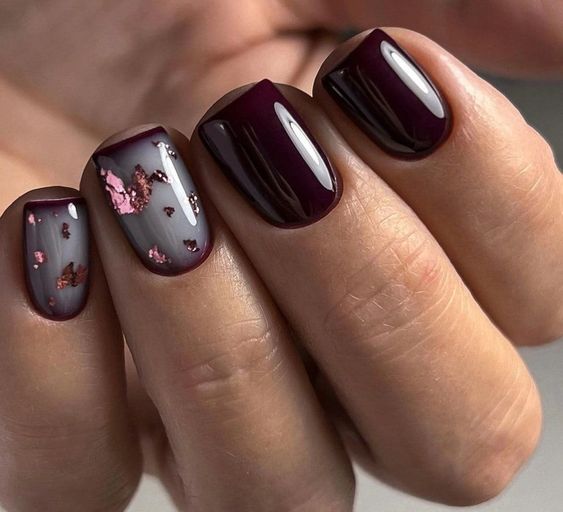 These short, rounded nails feature a deep wine red color with foil accents. The metallic foil adds a modern twist to the classic dark red, giving it a chic and contemporary edge. This design is perfect for those who prefer a minimalist yet stylish look. The foil accents can be applied to acrylic, gel, or natural nails, offering versatility and ease of maintenance. It’s a great choice for everyday wear, adding a subtle touch of sophistication to any outfit.