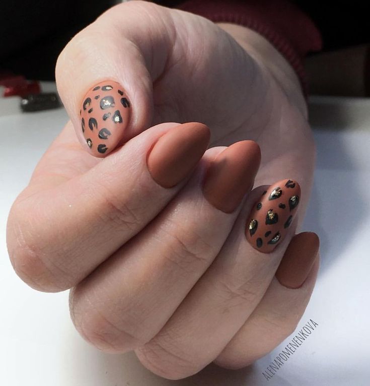 For a playful yet sophisticated look, these matte nails feature a warm brown base with leopard print accents. The round shape gives a soft and natural appearance, while the matte finish adds a modern twist. The leopard print adds a fun element to the otherwise neutral palette, making it perfect for those who love a bit of animal print in their fashion choices. This design works well with acrylic or dip powders, providing a durable and stylish finish.