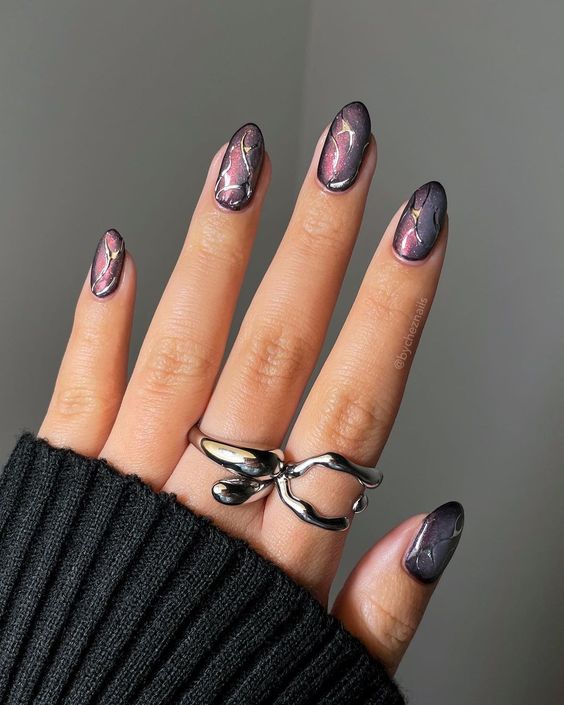 In this sophisticated design, nails are adorned with a metallic marbled pattern, combining shades of deep purple and silver. The oval shape complements the intricate design, creating a refined and elegant appearance. The marbling effect is perfect for those who enjoy artistic and unique nail art. The use of colors gel adds a high-shine finish, making the nails pop with every movement. This look is ideal for evening events or for adding a touch of luxury to everyday style.