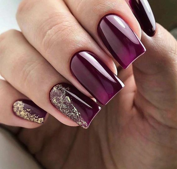 These stunning square nails feature a rich burgundy color, accented with gold leaf on one nail. The combination of deep red and metallic gold creates a regal and sophisticated effect, perfect for fall. The gel polish enhances the glossy finish, ensuring the nails remain vibrant and eye-catching. This design is ideal for those who want a classic yet luxurious look, perfect for both casual outings and special occasions.