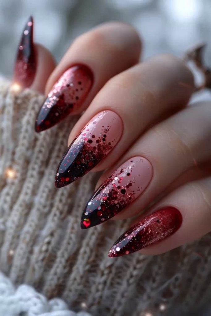 For a dramatic and festive look, these acrylic nails feature a gradient from deep red to black, with glitter accents. The coffin shape enhances the boldness of the design, making it perfect for those who love to make a statement. The transition of colors, combined with the sparkle, creates a stunning effect reminiscent of fall’s rich palette. This design is ideal for parties and special events, where you want your nails to stand out.