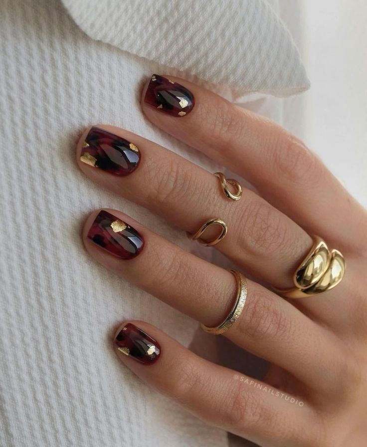 For a touch of luxury, these nails showcase a tortoiseshell design accented with gold flakes. The short, rounded nail shape is both practical and chic, making it perfect for everyday wear. The combination of dark brown and gold hues brings a rich, autumnal feel. This design is especially stunning on acrylic or gel nails, providing a sophisticated twist on classic fall colors.
