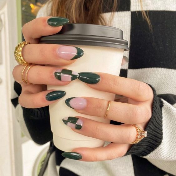 A modern take on dark fall nails, this design features a coffin shape with a mix of green and nude geometric patterns. The sleek acrylic finish adds a glossy touch, making the colors pop. This look is perfect for fashion-forward individuals who want to make a statement with their nails. The dark green tones are reminiscent of evergreen trees, adding a unique twist to typical fall color palettes.