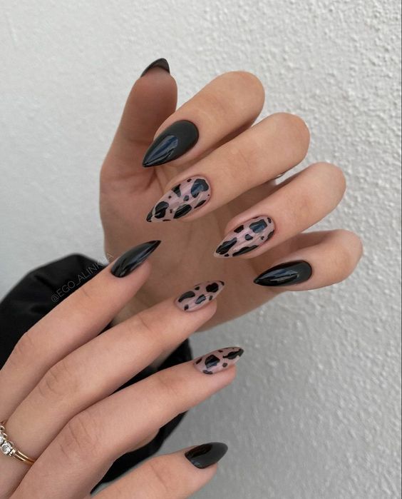 For those who love a bit of edge, these almond-shaped nails feature a striking black leopard print on a nude base. The contrast creates a bold and daring look that’s perfect for making a statement. The design can be achieved with acrylic or dip powders, providing a durable and long-lasting finish. This style is perfect for anyone who loves to experiment with nail art and isn’t afraid to stand out.