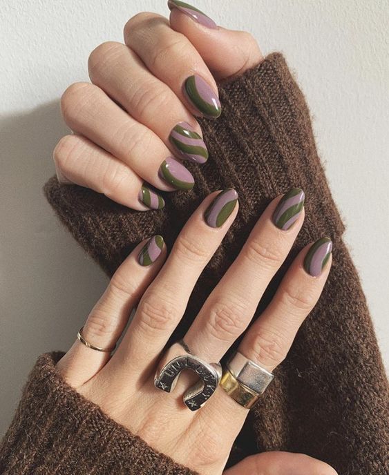 This design blends earthy olive and mauve tones in a swirling pattern, creating a cozy, autumnal vibe. The oval shape complements the natural feel of the colors, making this a great choice for those who prefer a more understated look. The combination of colors and the fluid pattern make these nails a perfect match for casual fall outfits, adding a touch of elegance to any ensemble.
