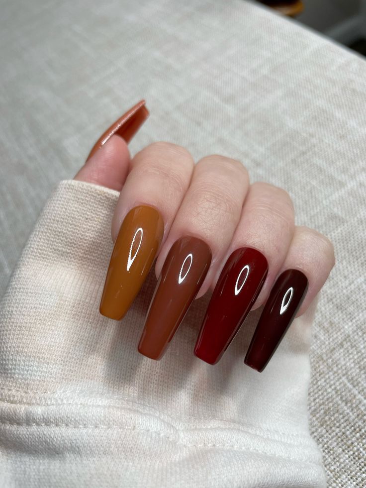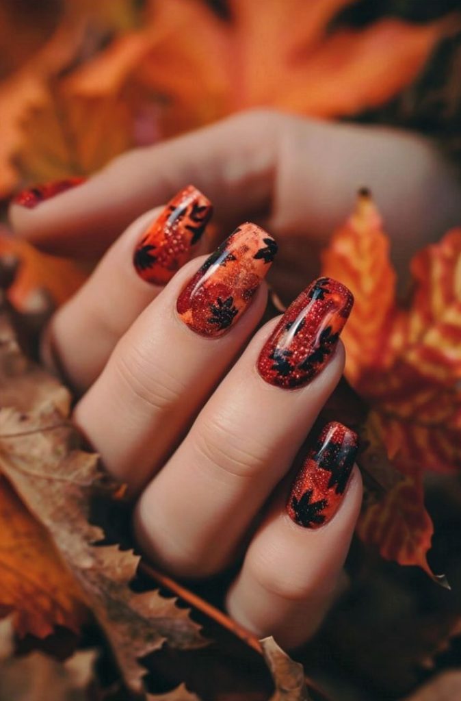 For a sleek and sophisticated look, these nails feature a gradient of autumnal colors, ranging from burnt orange to deep red. The square shape provides a clean and modern appearance, while the matte finish adds a chic, understated elegance. This design is perfect for those who prefer a minimalist approach but still want to capture the essence of fall.