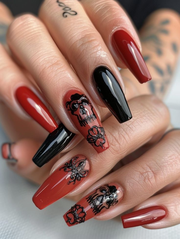 Dark and glamorous, this coffin-shaped design features a mix of red and black with intricate black lace patterns. The acrylic nails have a high-shine finish, perfect for those who want a bold and dramatic look. This style is ideal for a Halloween-inspired twist or for anyone who loves a gothic vibe. The combination of deep colors and intricate details makes these nails a standout choice for any occasion.