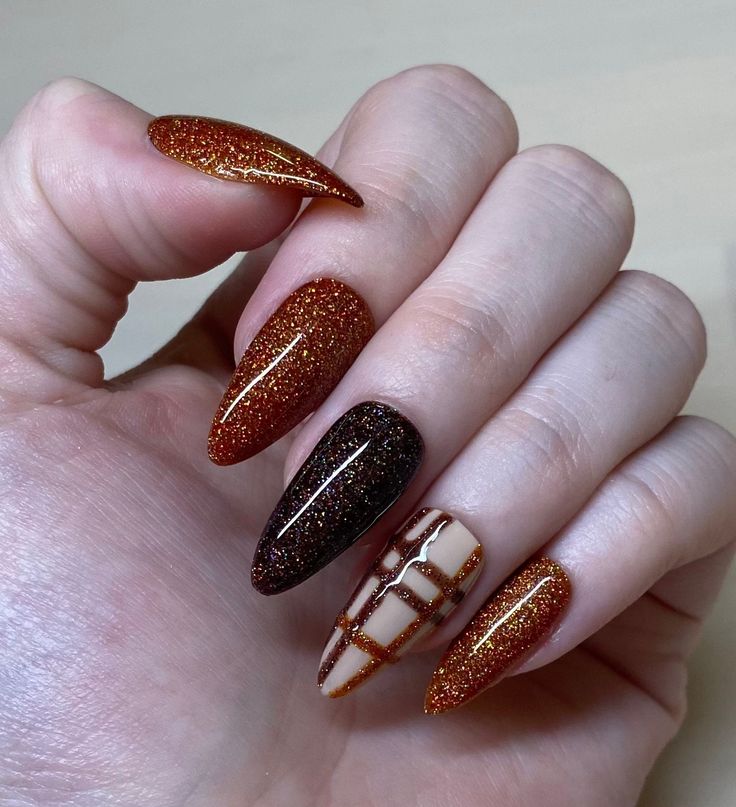 This set captures the essence of autumn with a dazzling array of copper glitter and a plaid accent. The almond-shaped nails alternate between a sparkling copper and a rich brown, with one nail featuring a chic plaid pattern in earth tones. The combination of glitter and pattern gives a cozy yet glamorous vibe, perfect for anyone looking to celebrate the season’s warmth. The design uses acrylic for a long-lasting and polished look, ideal for both everyday wear and special occasions.