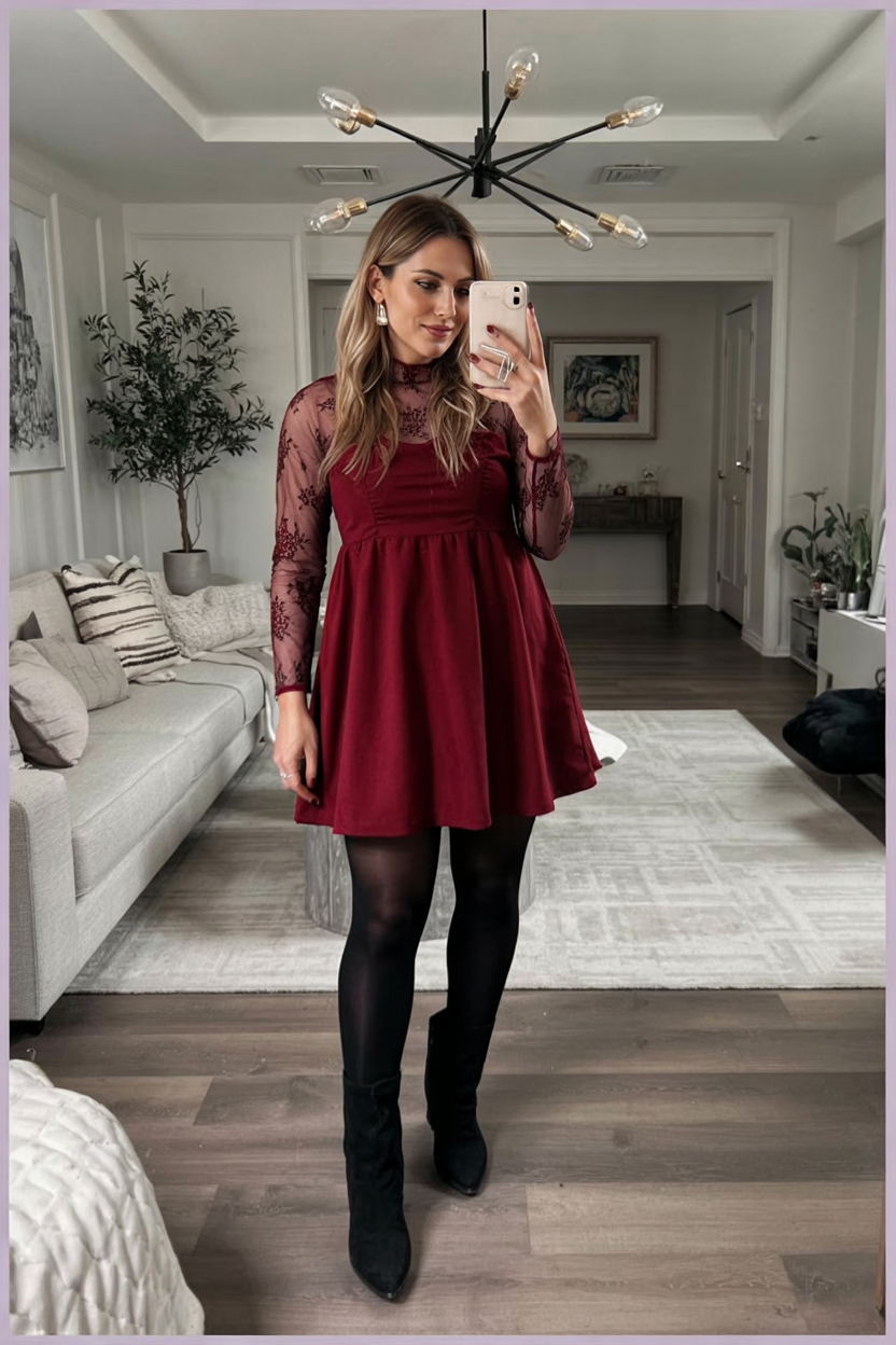 This deep burgundy dress is the kind of piece that makes a winter date feel instantly more romantic. The sheer lace sleeves and high neck add just enough drama, while the babydoll shape keeps it playful and flirty instead of too serious. Paired with black tights and suede boots, it has that perfect balance of sweet and sultry that works whether you’re heading to dinner with your longtime love or having a first-time going-out moment that still feels safe and confident.