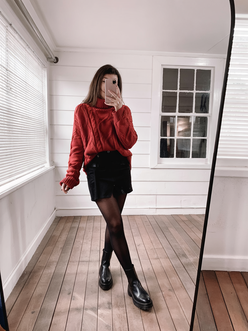 19. Red Cable Sweater, Mini Skirt & Chunky Boots