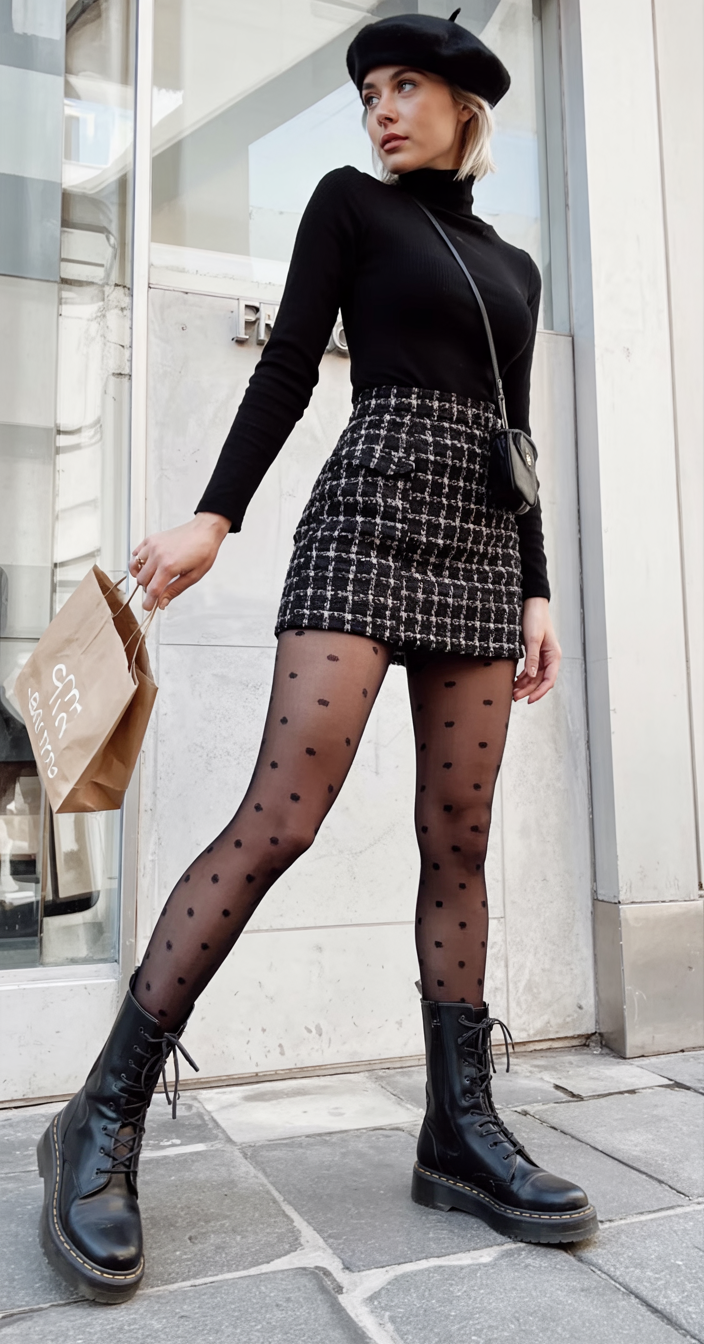 This look has that unmistakable “weekend in Paris” attitude: a fitted black turtleneck, tweed mini skirt, sheer patterned tights, and chunky boots finished with a beret. It’s flirty without being overdone, playful but still classy, and perfect for a fall or winter date where you’re walking around the city, grabbing coffee, and popping into a little wine bar when it gets cold. The mix of textures makes it feel interesting from every angle, even if you’re just running to meet your date after work.