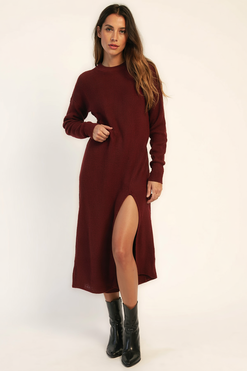 This long, wine-colored knit dress is the definition of effortless allure. The high neckline and full sleeves keep it cozy and covered, while the side slit flashes just enough leg to keep things interesting. Paired with simple black ankle boots, it feels perfect for a winter or fall date where you’re heading somewhere slightly upscale but still want to feel comfortable enough to linger over dessert. It’s soft, warm, and subtly romantic in a way that never tries too hard.