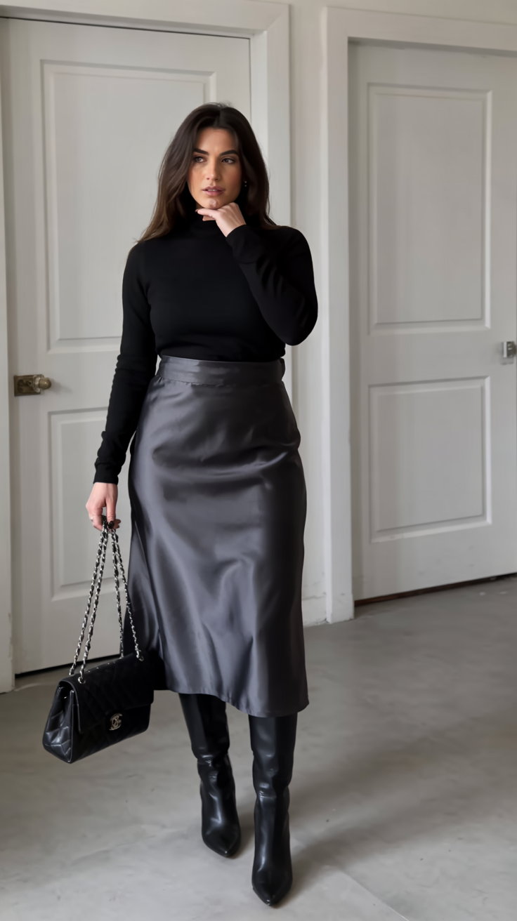 This look is pure quiet luxury: a simple black turtleneck tucked into a charcoal satin midi skirt, finished with sleek knee-high boots and a chain-strap bag. It’s understated but undeniably elegant, the kind of outfit that feels right at home in a nice restaurant, at a winter movie and dinner date, or even a slightly dressy work-to-date situation. The monochrome tones elongate the body and give you that effortless, put-together presence.