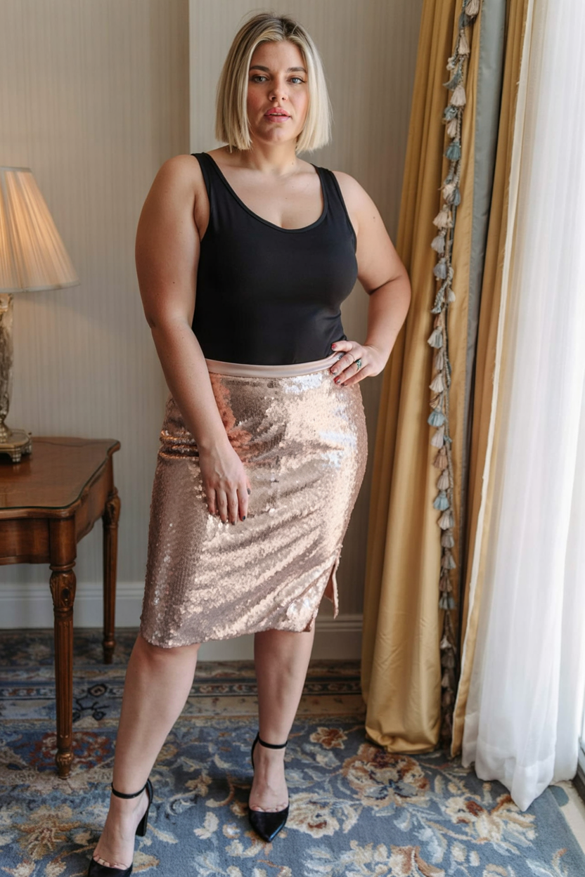 If you’ve ever wondered whether a sequin skirt is “too much” for date night, let this look be your sign to absolutely go for it. The black tank keeps the top half sleek and simple, while the rose-gold sequins bring all the party energy from the waist down. On a curvy figure, the pencil shape hugs in all the right places without feeling restrictive, making it perfect for New Year’s, anniversary dinners, or any night that calls for a little sparkle.