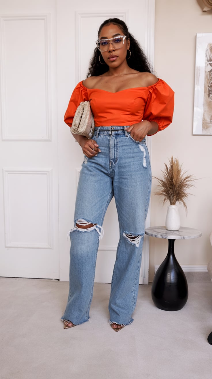 This puff-sleeve, off-the-shoulder top paired with ripped jeans is the definition of fun, casual date night style. The bold color brings all the energy, framing your shoulders and collarbone beautifully, while the relaxed jeans keep the whole look grounded and easy. It’s perfect for summer nights when you’re grabbing tacos, cocktails, or just walking around the city feeling like the cute, confident lead in your own story.