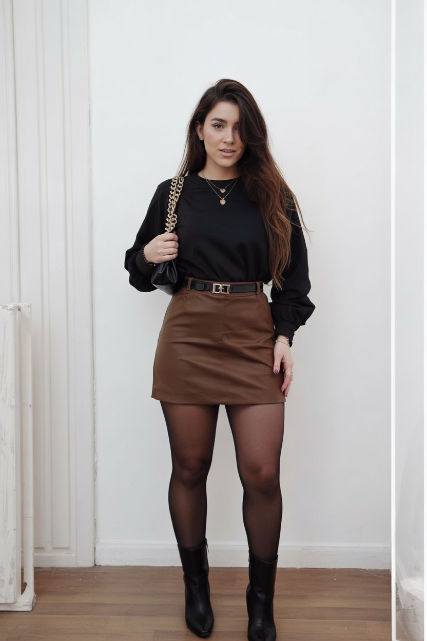 This outfit is such a rich, warm take on date night neutrals: a silky black blouse tucked into a caramel mini skirt, sheer tights, and sleek ankle boots. The chain-strap bag and delicate layered jewelry add just enough shine to keep things from feeling too serious. It’s perfect for autumn and winter nights when you want something a little more dressy than jeans, but you’re not in the mood for a full-on dress.