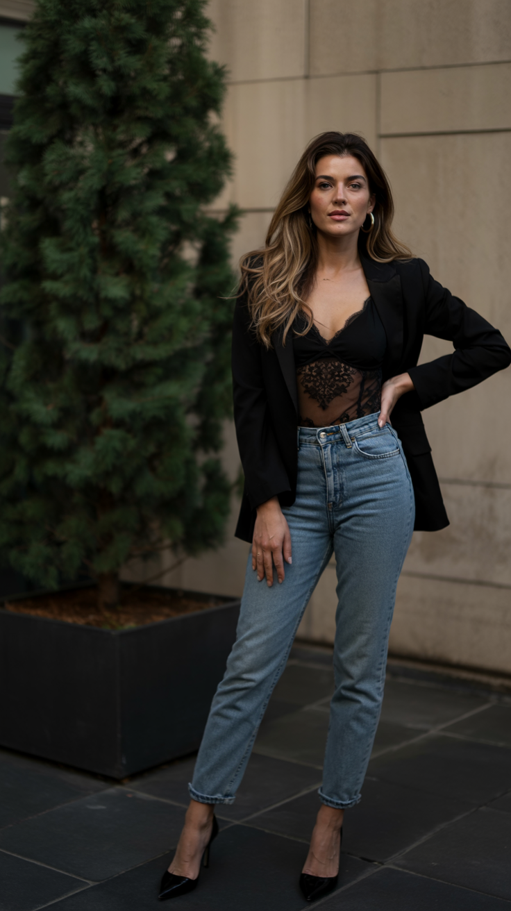 If you want to feel like the main character on a city date night, this mix of a lace bodysuit, sharp blazer, and high-waisted jeans is a winner. The peek of lace adds a romantic edge without feeling over the top, while the structured jacket keeps everything looking classy and pulled together. It’s the kind of outfit that works for rooftop drinks, a movie after dinner, or strolling around downtown pretending you have absolutely no early meeting tomorrow.