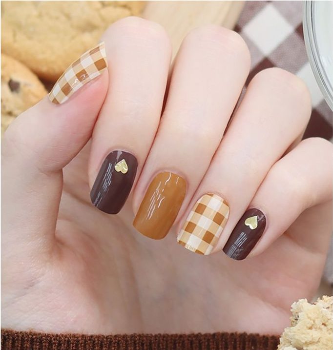These nails feature a charming gingham pattern in warm brown and mustard tones, accented with tiny gold hearts. This cute and cozy design is perfect for embracing the fall season with a touch of whimsy.