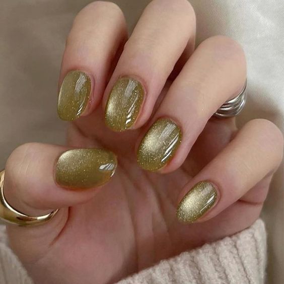 Olive shimmer nails bring a subtle sparkle to your fall look. The shimmering finish adds depth and interest to the earthy green, making it a great choice for simple yet elegant fall nails.