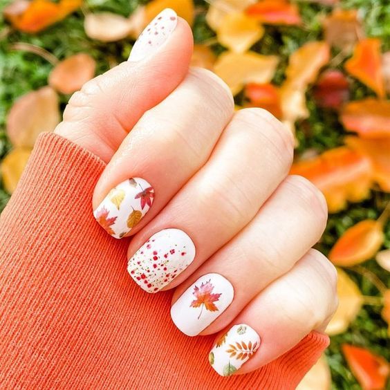 This design is all about embracing the vibrant colors of fall. The bright leaves on a crisp white base create a stunning contrast, making your nails pop. A great idea for those who love fall gel nails with a bit of color and fun.