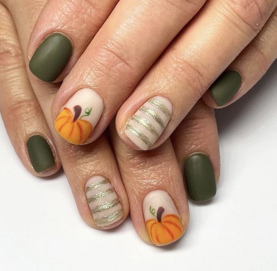 Nothing says fall like pumpkins! These adorable nails feature cute pumpkin designs paired with olive green and gold stripes, capturing the essence of the season. Perfect for acrylic nails for fall that are both simple and charming.