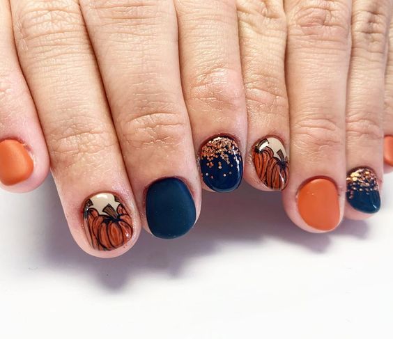 For a more dramatic look, these nails blend deep navy and vibrant orange with glittering pumpkins. The short round shape adds to the charm, making these short acrylic nails designs for fall round a standout choice for those looking to make a statement.