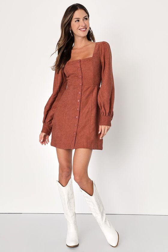 Rust is a color that screams fall, and this button-down mini dress showcases it beautifully. The square neckline and puffed sleeves add a touch of vintage charm, while the fitted silhouette ensures a modern feel. Pair this dress with white cowboy boots for a trendy contrast. This outfit is ideal for a night out or a stylish dinner date, offering a perfect blend of classic and contemporary elements.