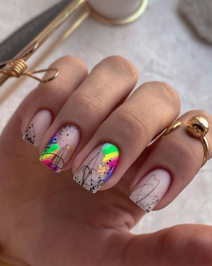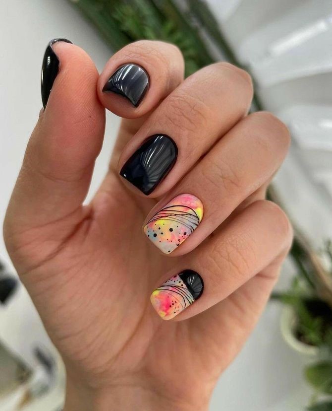 Abstract rainbow swirls meet minimalistic black speckles in this vibrant design perfect for summer 2025. The combination of neon and muted tones creates a dynamic balance of fun and sophistication. Ideal for festivals or casual outings, this style complements bold outfits with geometric or vibrant patterns.
