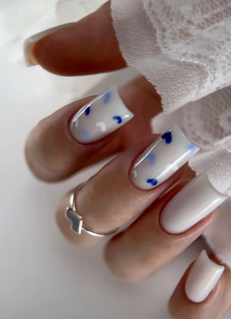 This simple yet cute nail art incorporates blue and white tones, creating a crisp, fresh look. Tiny heart-shaped accents bring a playful yet sophisticated feel, making it perfect for summer 2025 and ideal for casual brunches or date nights.