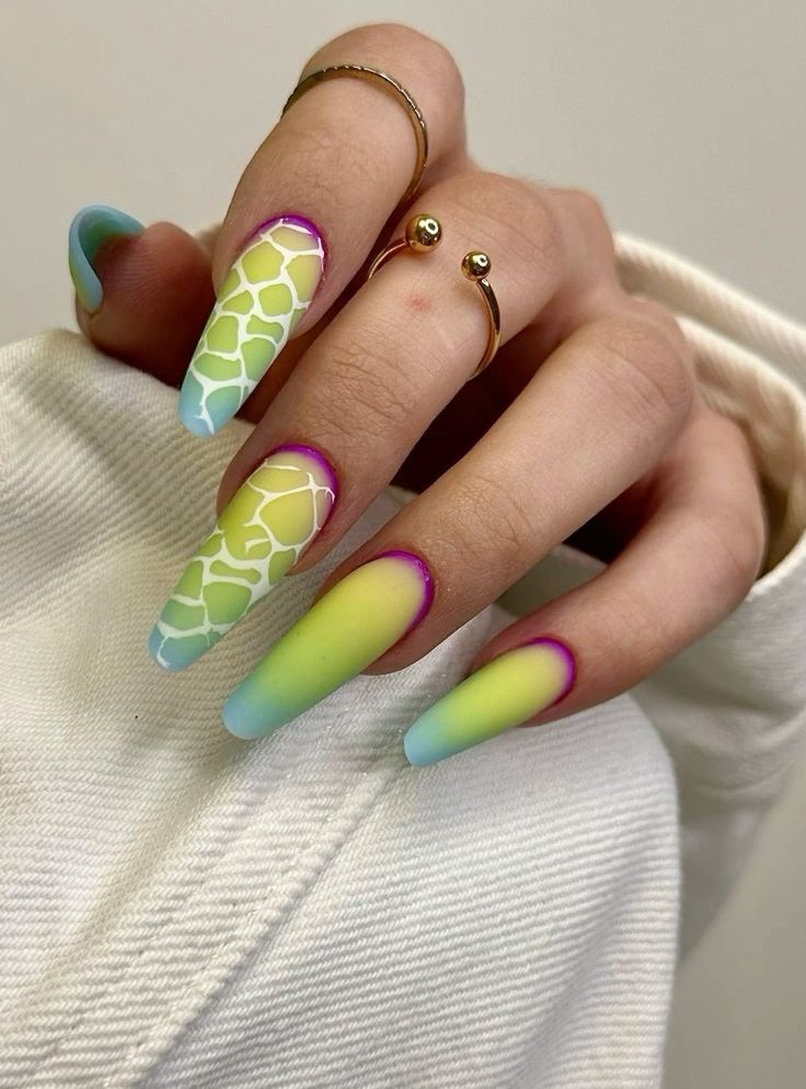 Gradient yellow-to-green hues meet giraffe-inspired patterns, giving a bold and playful edge for 2025 summer almond designs. The long almond shape ensures elegance, while the vibrant colors are perfect for adventurous personalities.