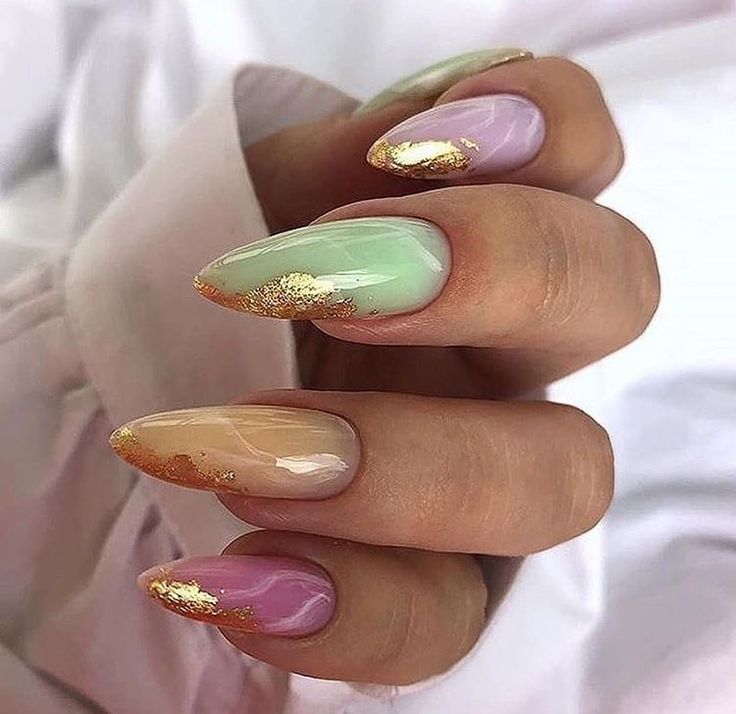 Soft pastel tones—mint green, peach, and lavender—combine with delicate gold foil accents for a glamorous and feminine style. This design works beautifully for spring 2025 or even as a subtle nod to Diwali celebrations.