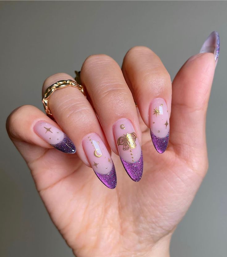 Add a cosmic touch to your style with purple glitter tips and gold celestial designs. This enchanting nail art is perfect for 2025 autumn and November celebrations, offering a mystical yet refined look.